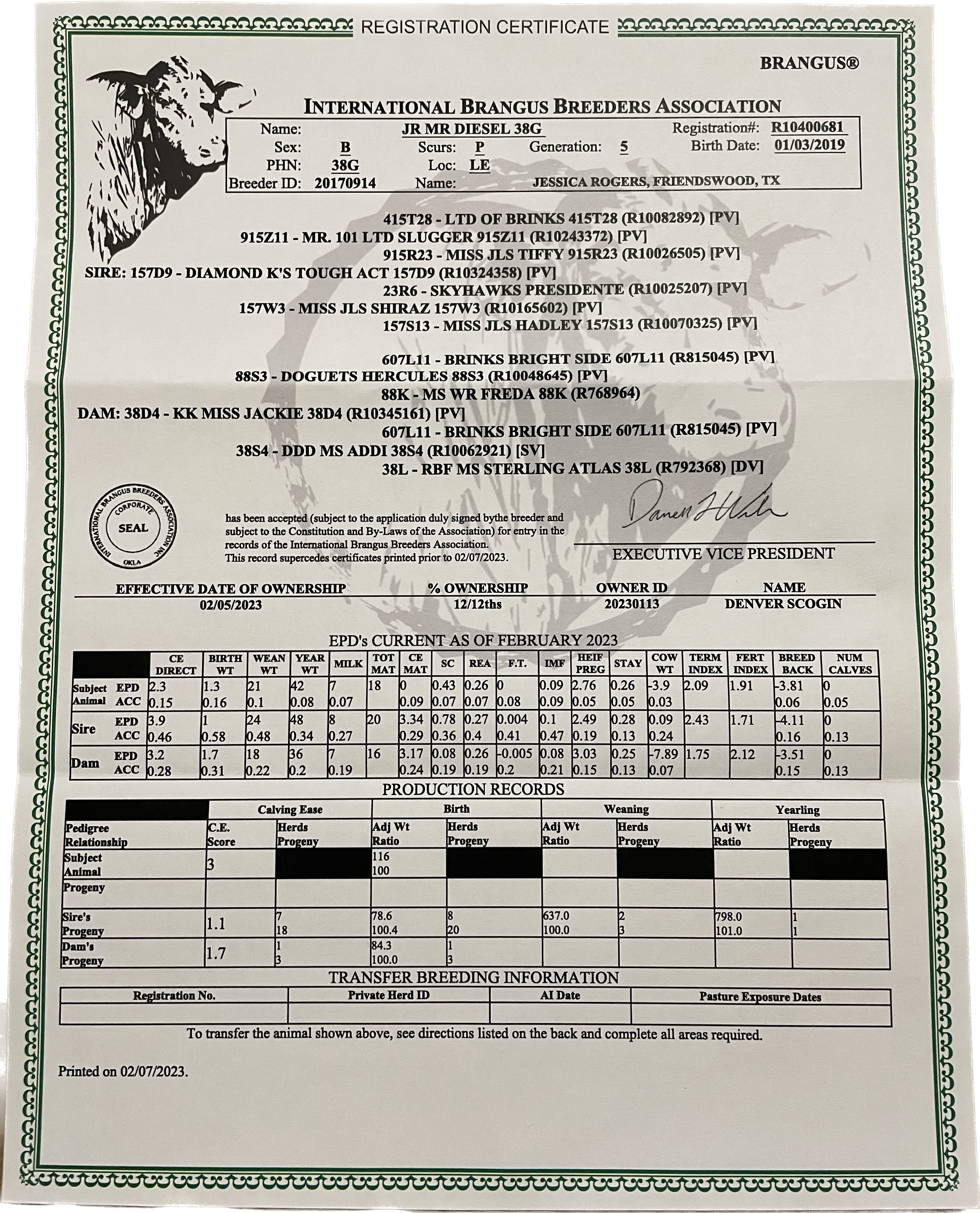 This Registered Brangus is fully tested and ready for your ladies. $300/month and a $50 Trich Re-Test fee.